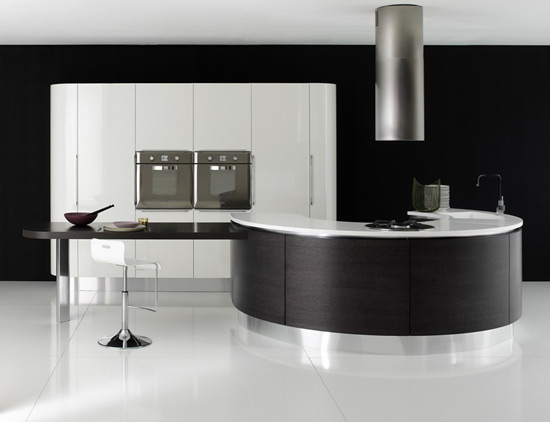 Esta cocina cuenta con un módulo de PVC sobre la pared, en algunos casos puede utilizase melamina, entre paredes negras se destacan los módulos blancos que contrastan con la tonalidad del negro, un semicírculo donde se encuentra el área de la cocina y el mesón a un lado que puede servir como especie de comedor en caso de que lo que preparemos sea algo rápido, obviamente el estilo de esta cocina solo puede ser aplicado en espacios grandes o ambientes ámplios para que se pueda disfrutar de este estilo de cocina.